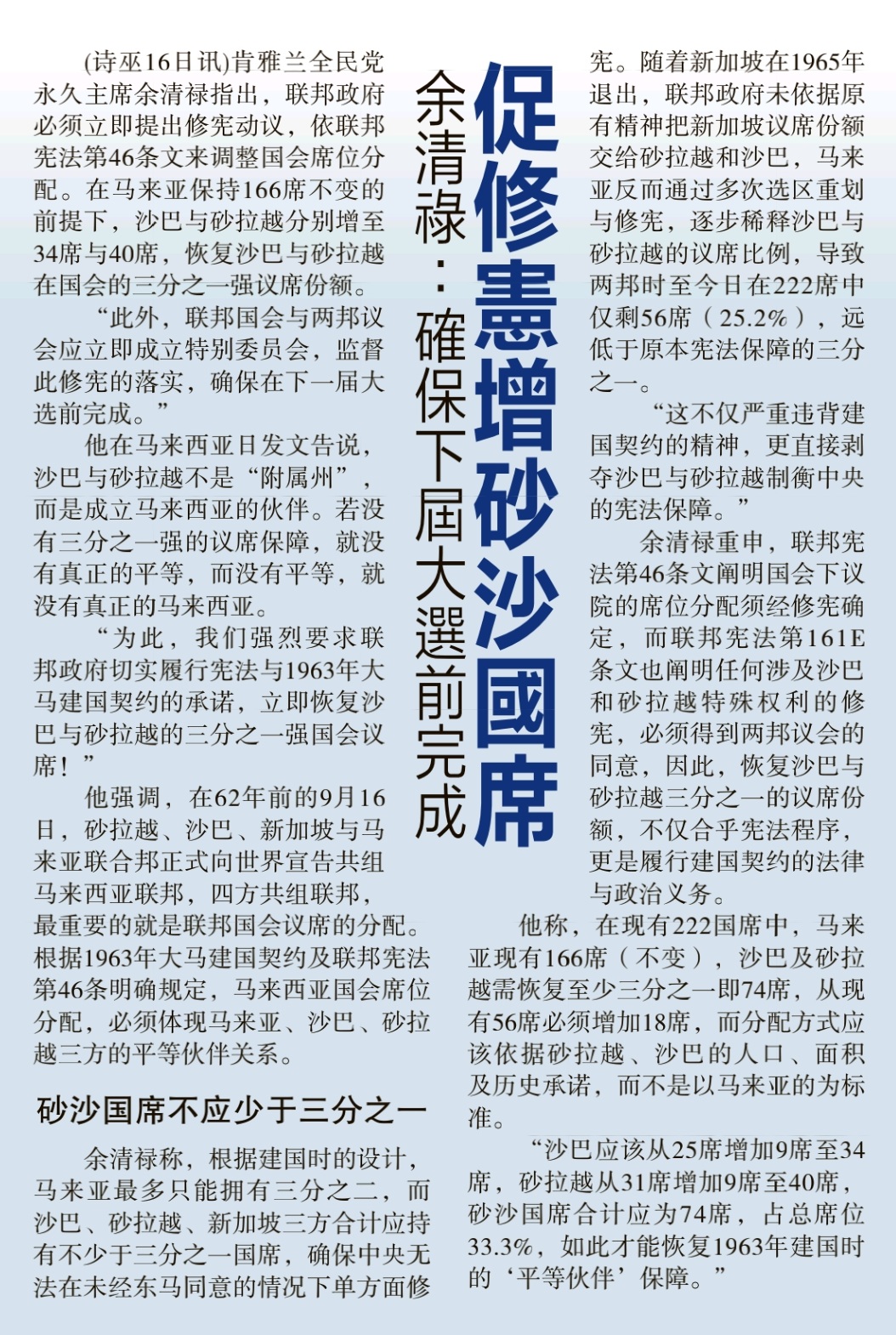 强烈要求联邦政府立即恢复沙巴与砂拉越在国会的1/3强议席份额