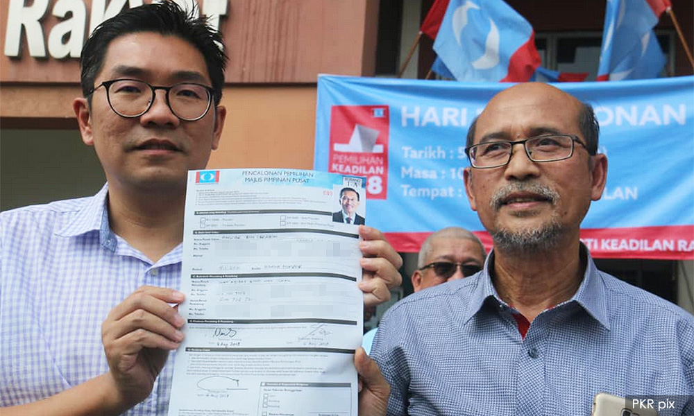 安华是获得妻子兼原任主席旺阿兹莎提名竞选,并获得公正党策略主任沈志勤(图中左者)复议。沈志勤在早上11点15分代表安华提呈提名表格。