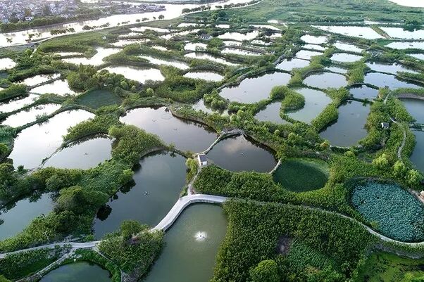 这些树是桑树,是用来养蚕的。两千年来,这片地区的中国人发展出许多高度复杂且可持续的农业生态系统。其中最著名的当属桑基鱼塘,见下图:
