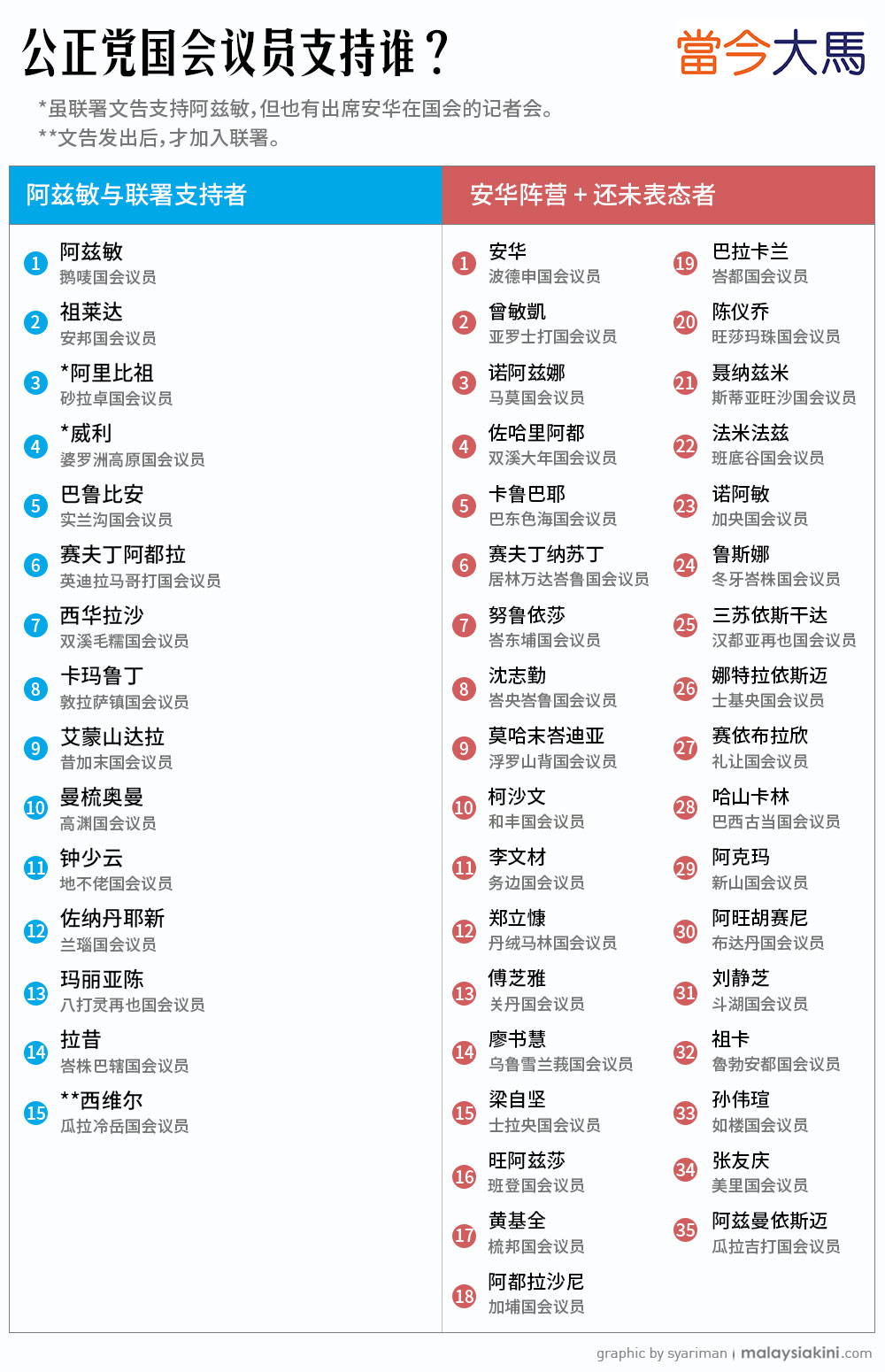 公正党署理主席阿兹敏阵营今早亮出27名领袖名单,下杀棋不足半天,党主席安华即刻拉得两名参与联署的国会议员开记者会,化解阿兹敏攻势。