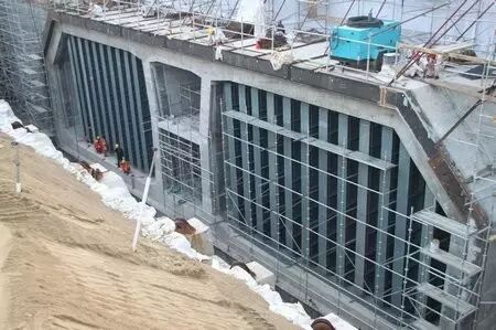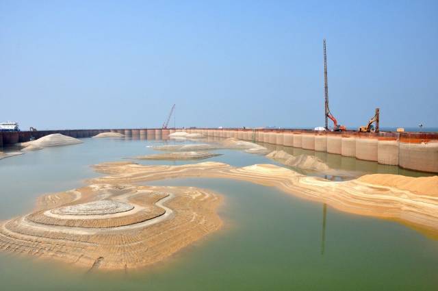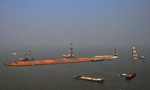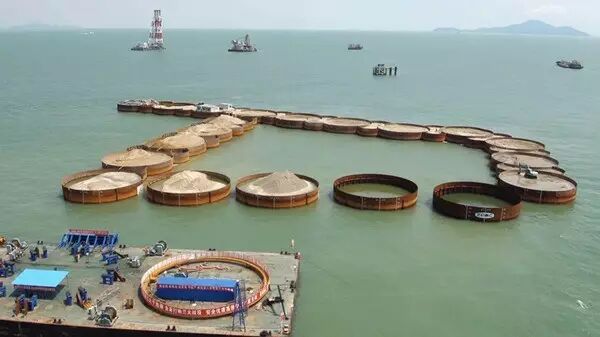 ▼巨型钢筒串成人工岛的框架