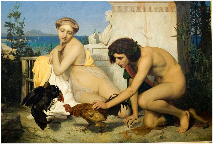 法国画家法-让·莱昂·热罗姆作品《玩斗鸡的希腊年轻人》。2004年4月19日,法国邮政为画家热罗姆逝世100周年发行过一枚纪念邮票,选用的就是这幅画。
