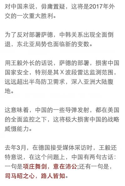 第一、对中国而言,暂缓部署萨,将是一个重大外交胜利。坚决反对,强烈反制,迫使对方不得不改弦更张,这也显现了中国外交的定力和实力。