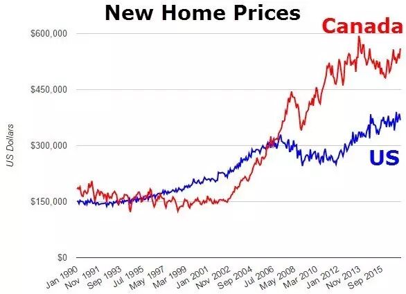那么这个房价走势到底高不高,我们可以参照与其接壤的美国来对比一番。