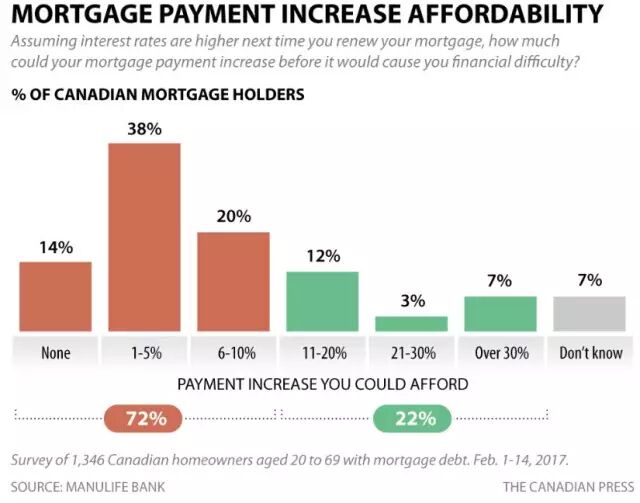 简而言之,72%的接受调查的加拿大房主,月供在目前的基础上增加10%就超出了他们的经济承受能力。