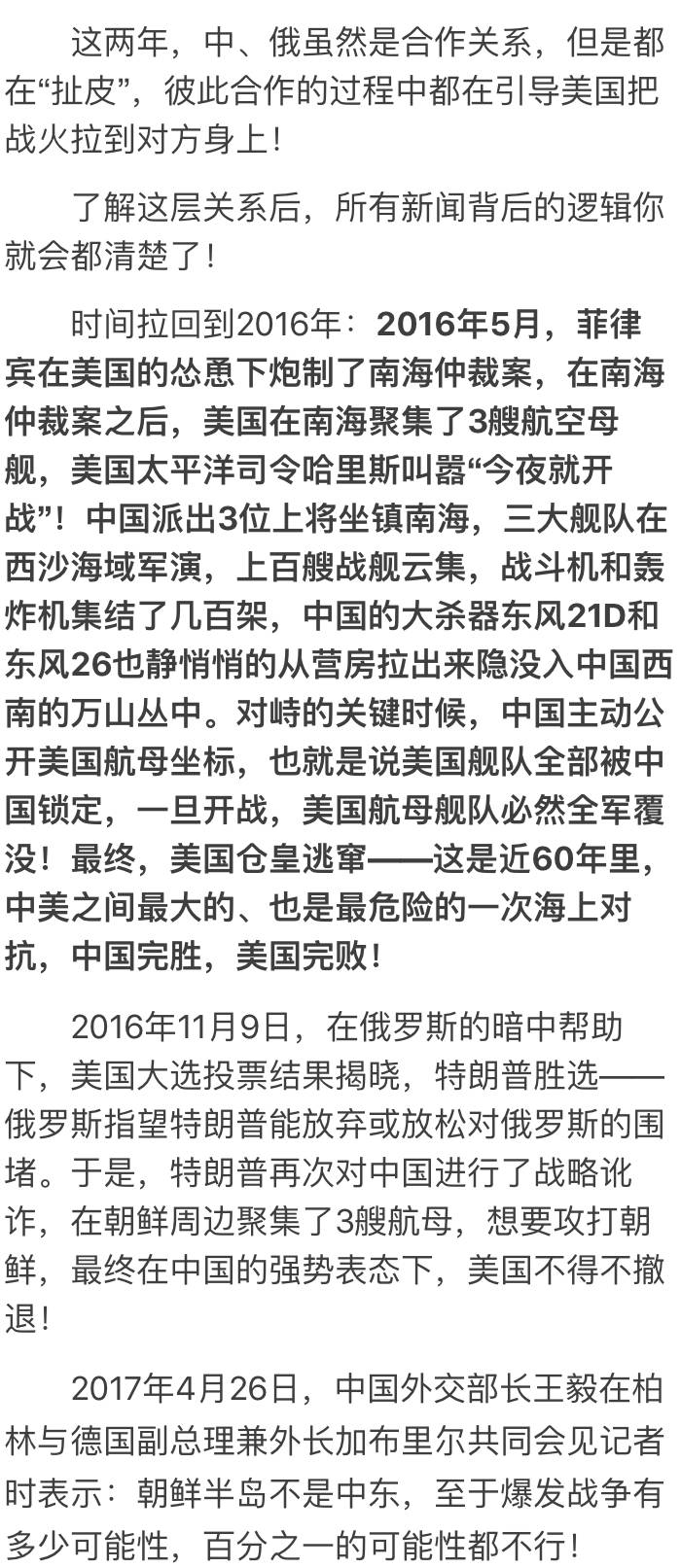 注意,在这个过程中俄罗斯的表现就开始反常:在美国即将撤退时,俄罗斯给朝鲜撑腰,给菲律宾撑腰,其主要目的就是为了让中国和美国在西太平洋上干起来——只有中美干起来,必然两败俱伤,那时俄罗斯在中、美、俄的博弈就会占据主动!