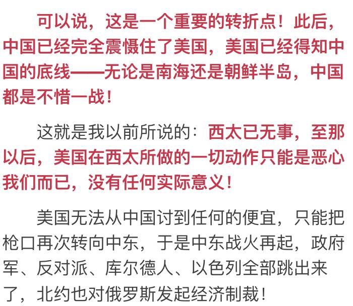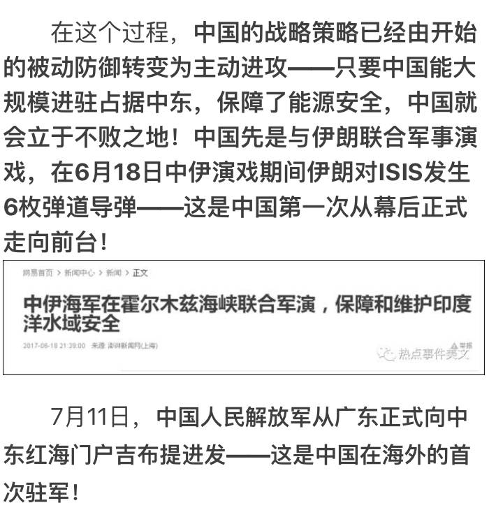 可以说,形势对中国极其的有利——相反,对美俄都是巨大的威胁!不过,碍于中俄同盟的关系,俄罗斯无法公开反对中国大量军事进驻中东!