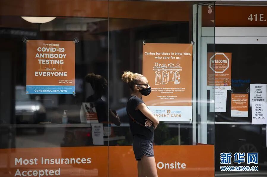 ▲7月8日,一名女子在美国纽约一家诊所外等候进行新冠病毒检测。新华社记者 王迎 摄