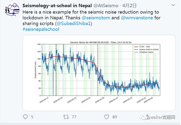 最先察觉到这个变化的是比利时皇家天文台的科学家:“自政府实施限制措施以来,频率在1-20赫兹之间(比低音提琴的声频更低,相当于一个大风琴)的地表运动强度比平常要低得多。”