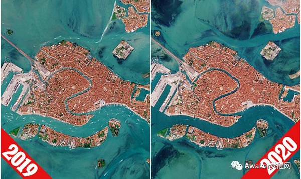 美国国家航空航天局(NASA)发布了本月和去年同期捕获的意大利城市的卫星图像,在意大利封锁期间,威尼斯曾经繁华的水道现已空无一人。