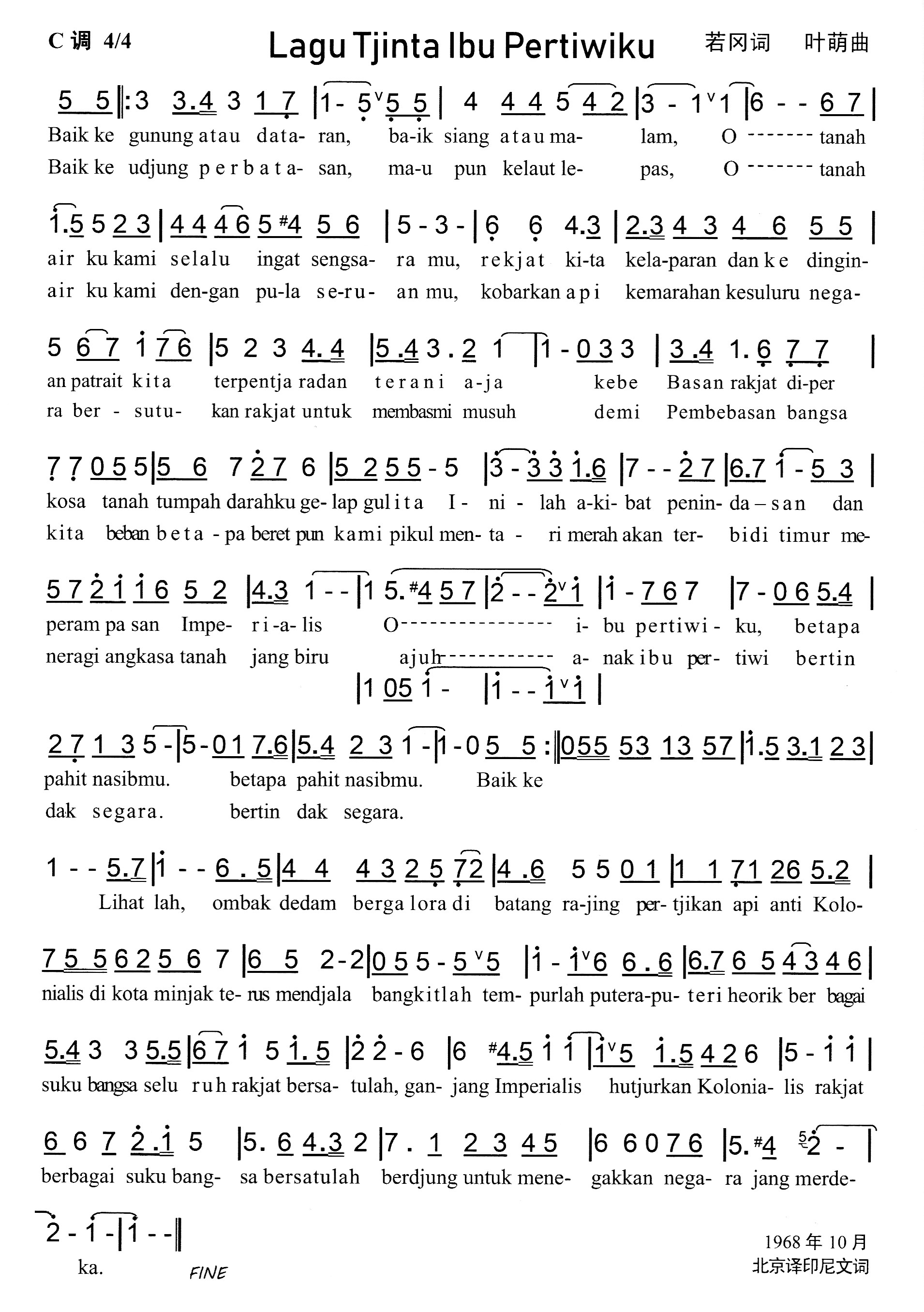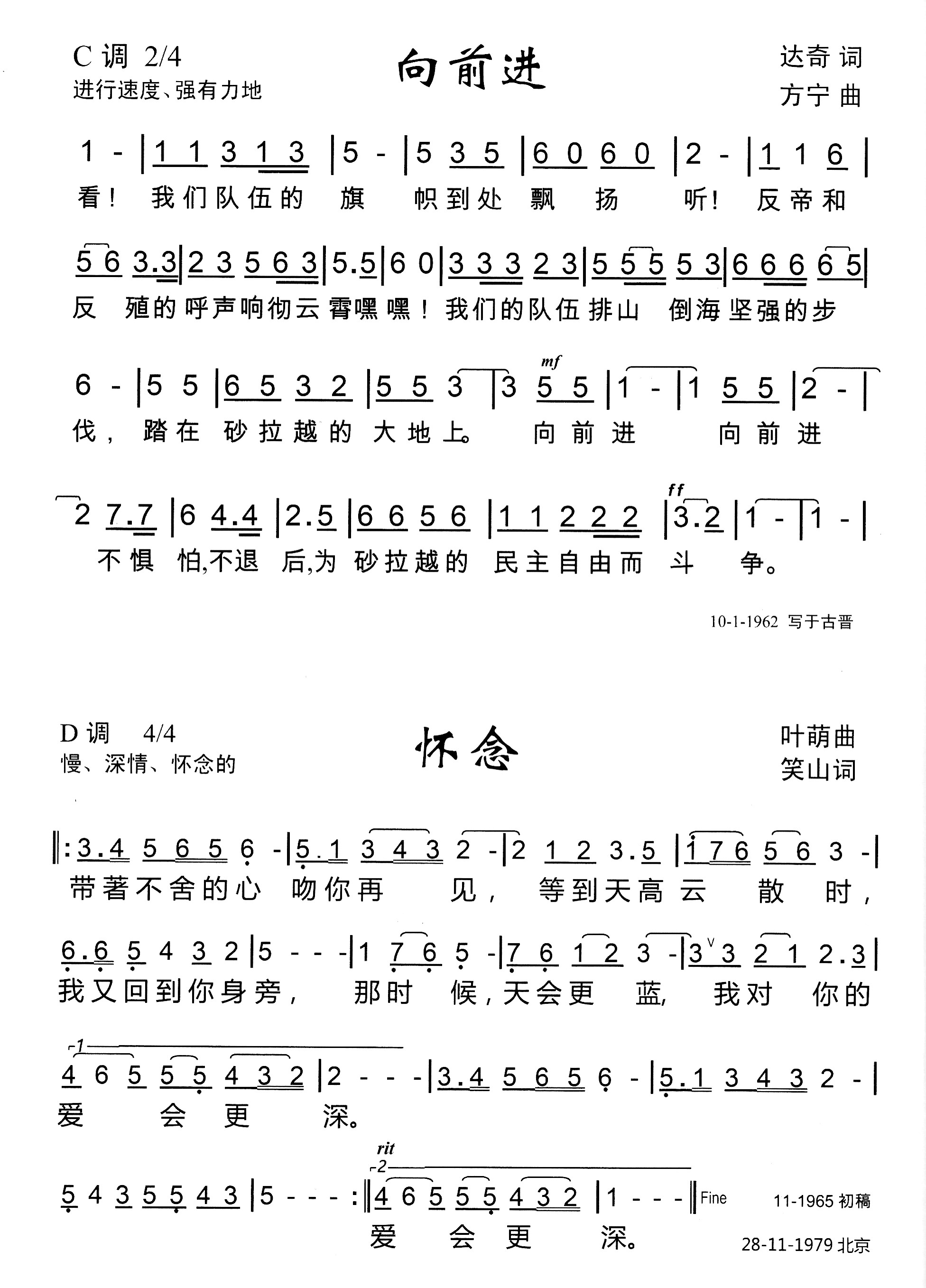 创造新的砂拉越、青年团颂歌、人民的吼声、友谊之歌、我们的旗帜、向前进、怀念、再见吧!亲爱的妈妈、毕业歌、解放祖国的好江山、祖国恋歌、Lagu Tjinta Ibu Pertiwiku