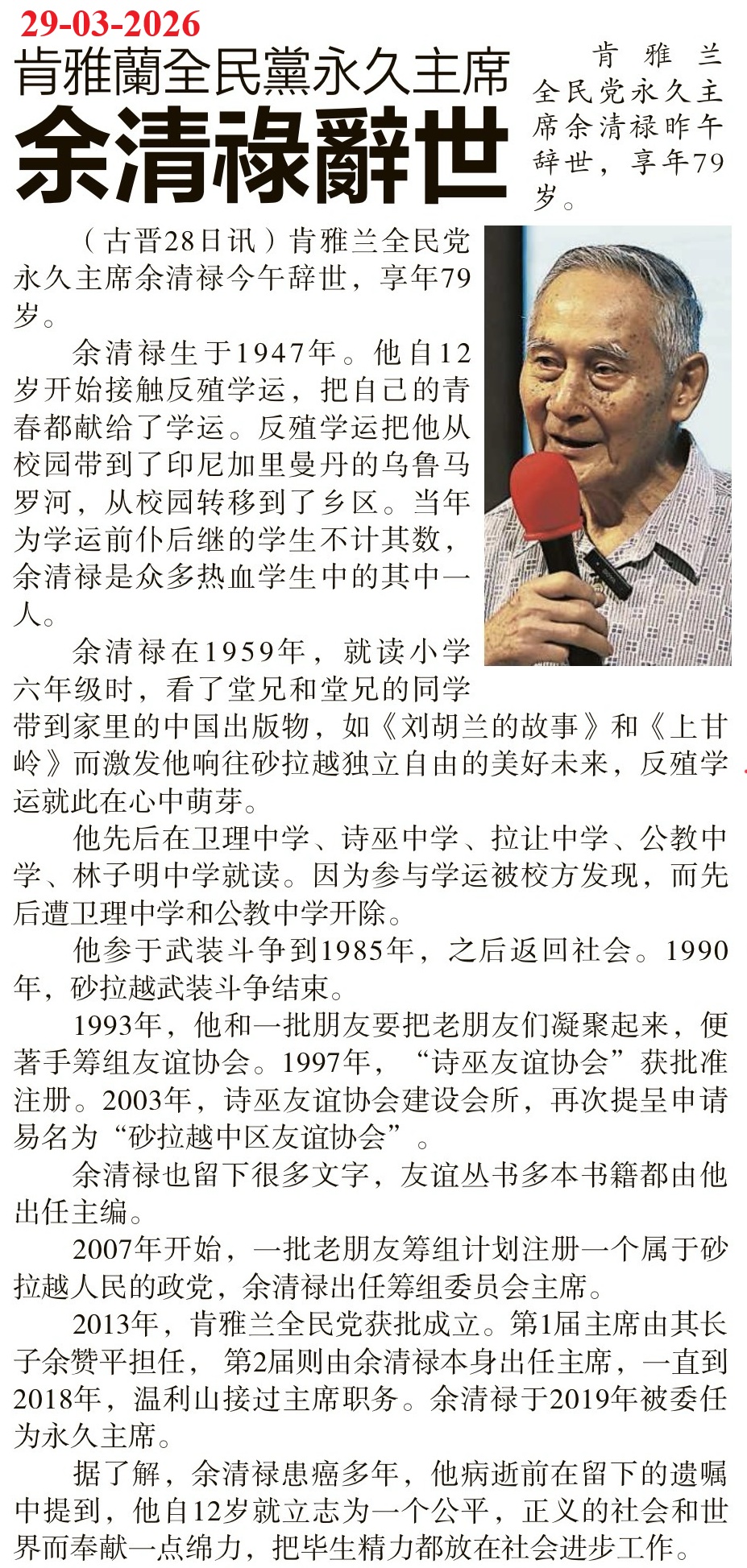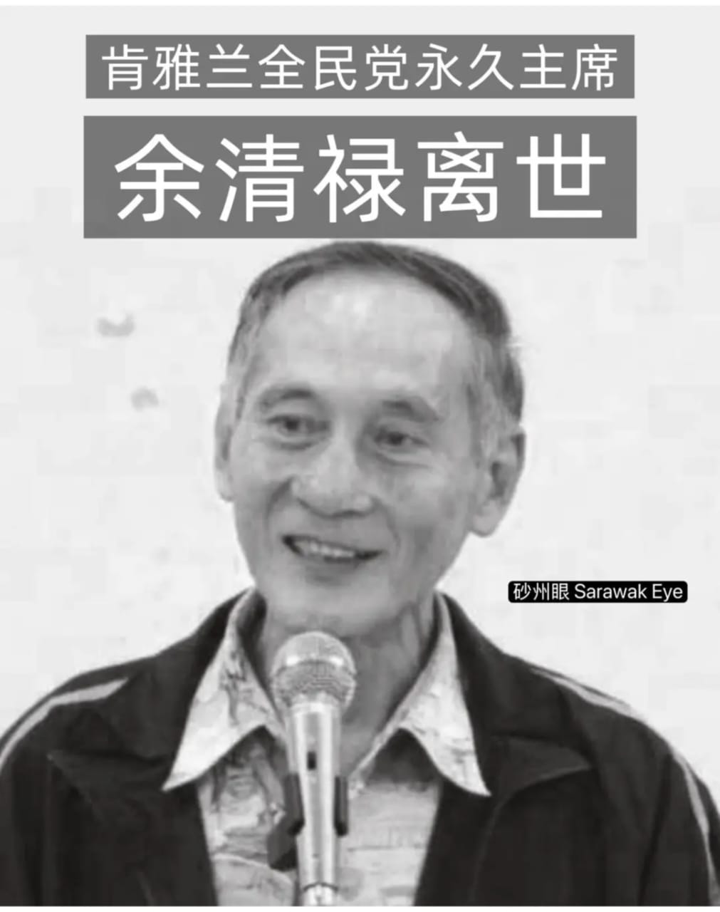 古晋28日讯,肯雅兰全民党永久主席余清禄今午辞世,享年79岁。