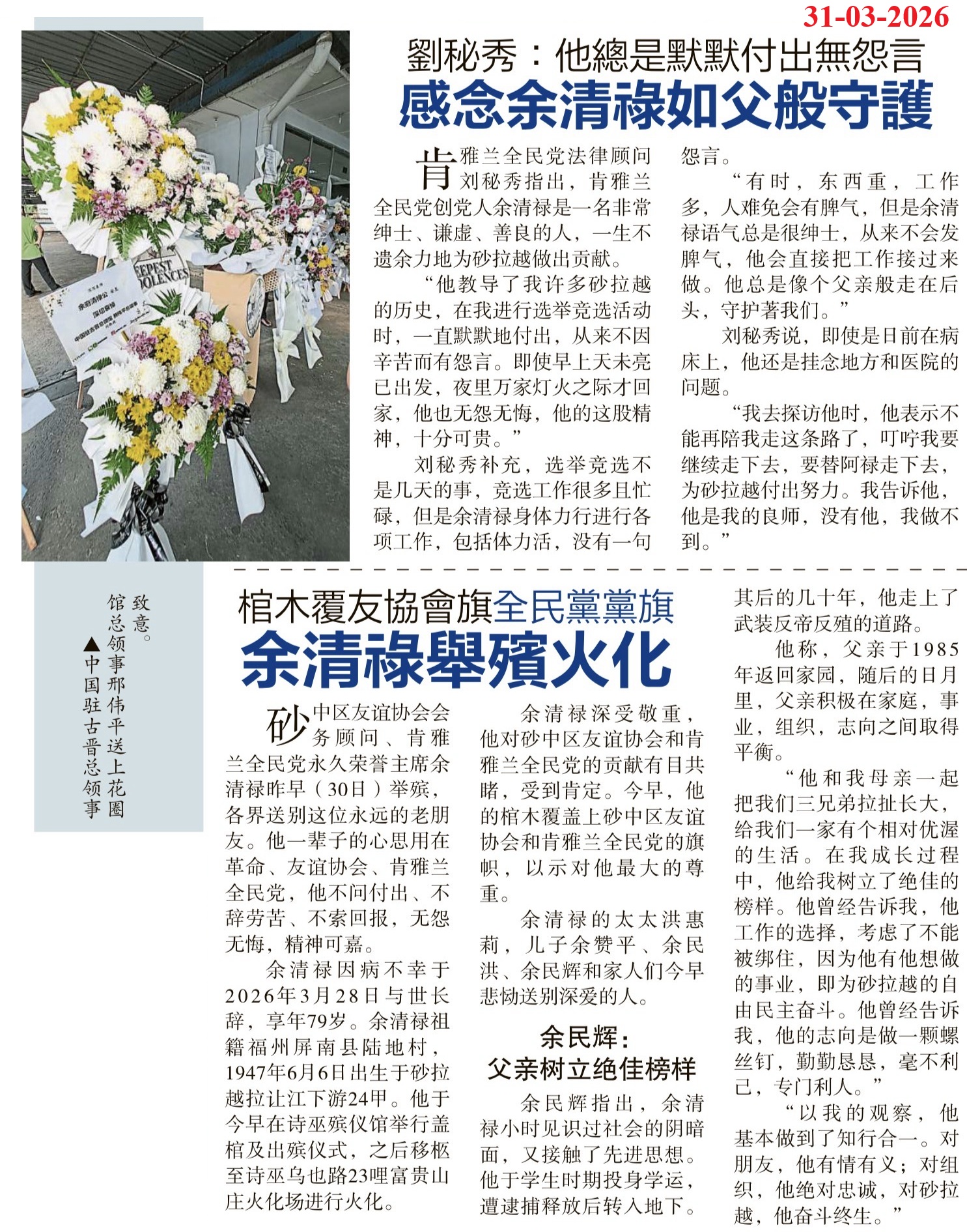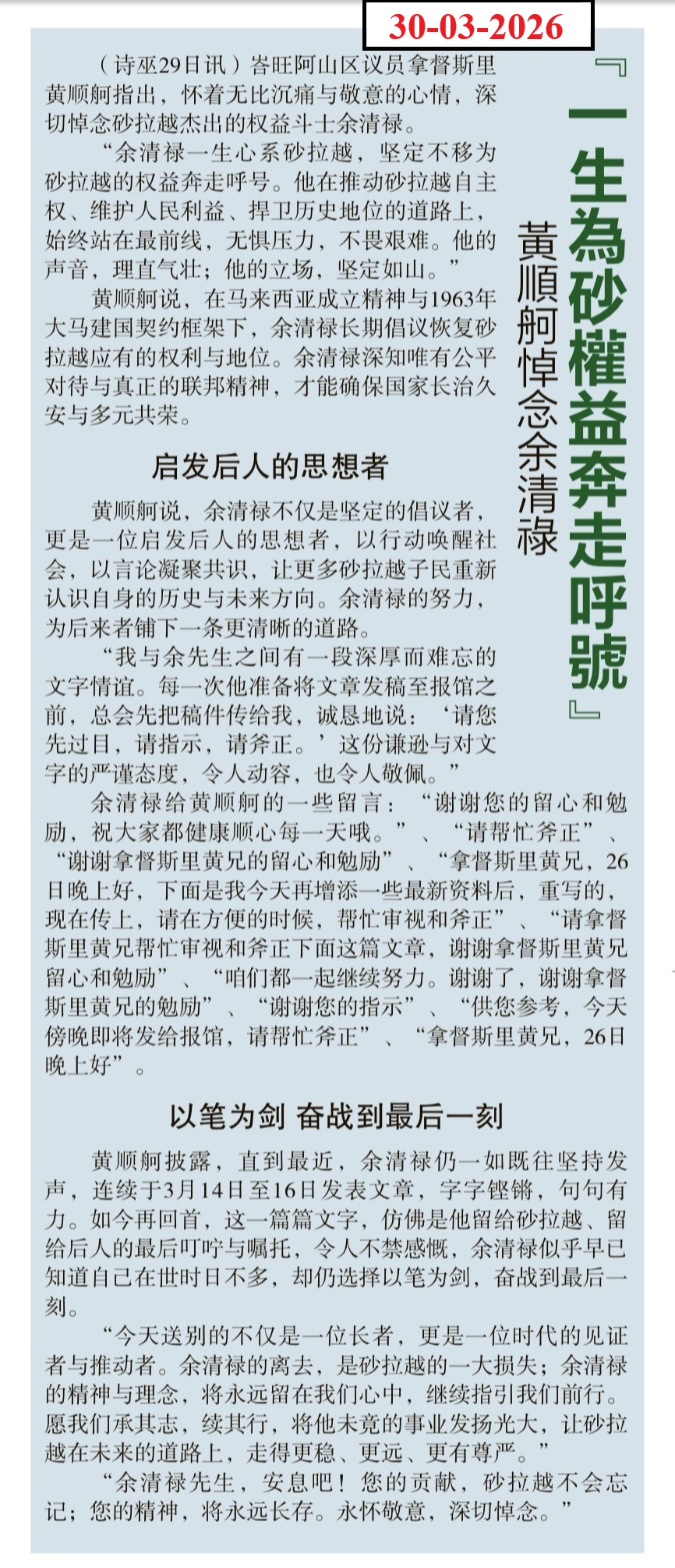 余清禄同志是不可多得的人才,是砂拉越人民的好儿子。本可继续为人民事业与人类理想作出更大贡献,然而却不幸与我们永别。斯人已逝,风范长存。
