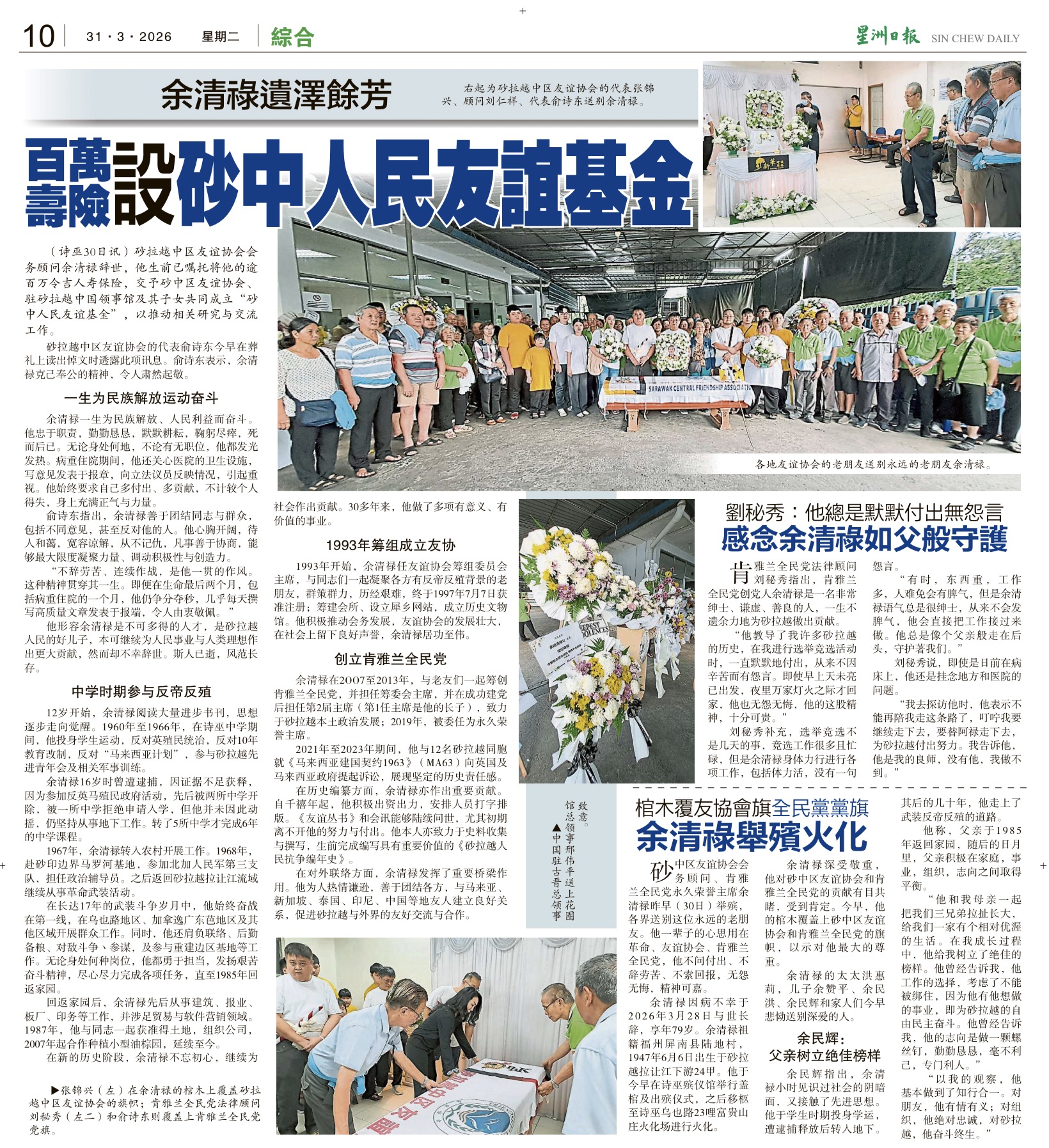 值得一提的是,他生前拥有逾百万的人寿保险,并决定将之委托砂中区友谊协会、与驻砂拉越中国领事机构及其子女共同成立“砂中各民族友好基金”,以推动相关研究与交流工作。这种克己奉公的精神,令人肃然起敬。