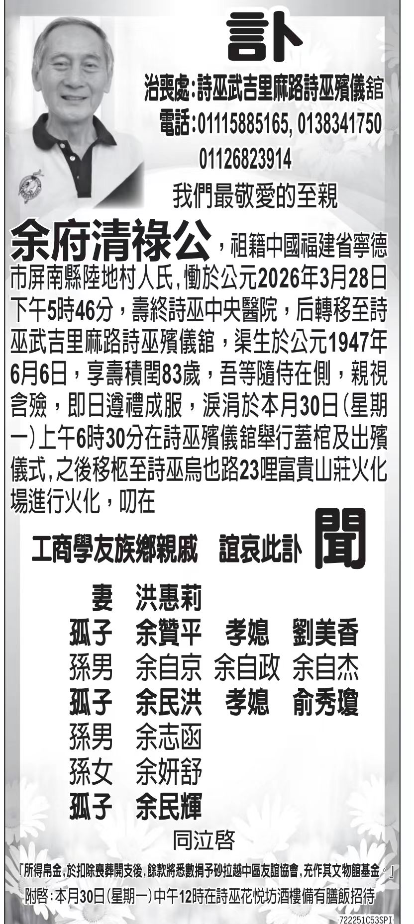 在此,我们怀着无比沉痛的心情告知大家:我们亲密的战友、前北加人民军干部余清禄同志,因病不幸于2026年3月28日与世长辞,享年79岁。