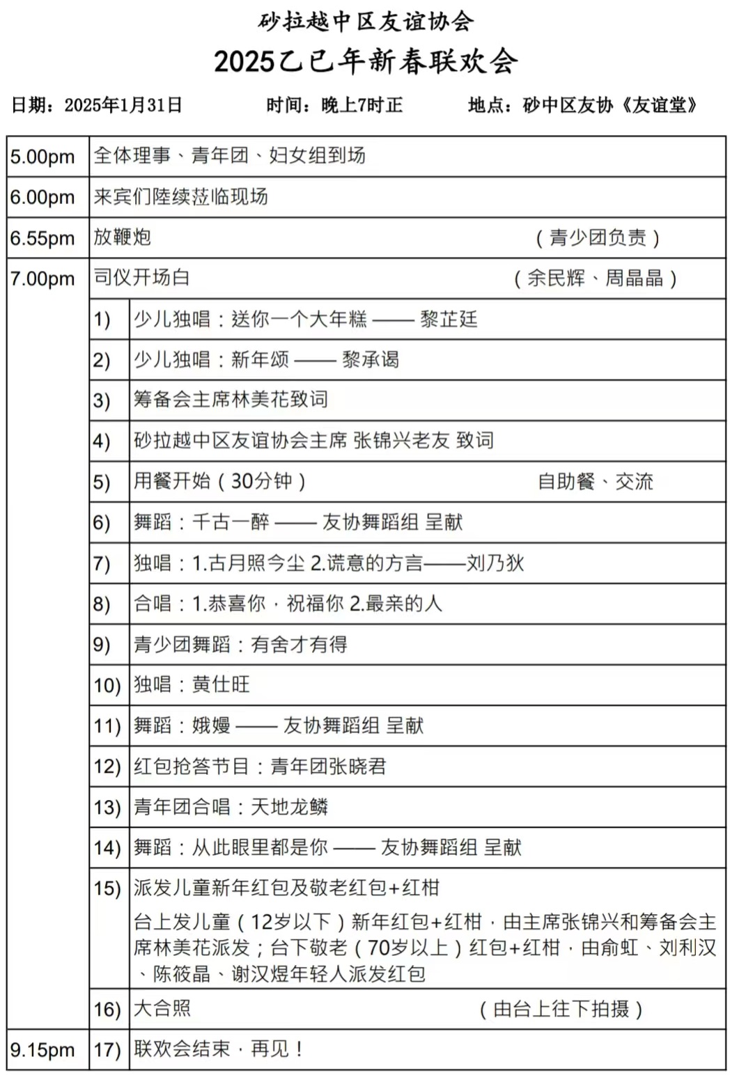 - 台上派发最年长(90岁以上)如有。其他敬老红包在台下由 俞虹, 刘利汉,陈筱晶,谢汉煜派发。儿童红包在台上发。