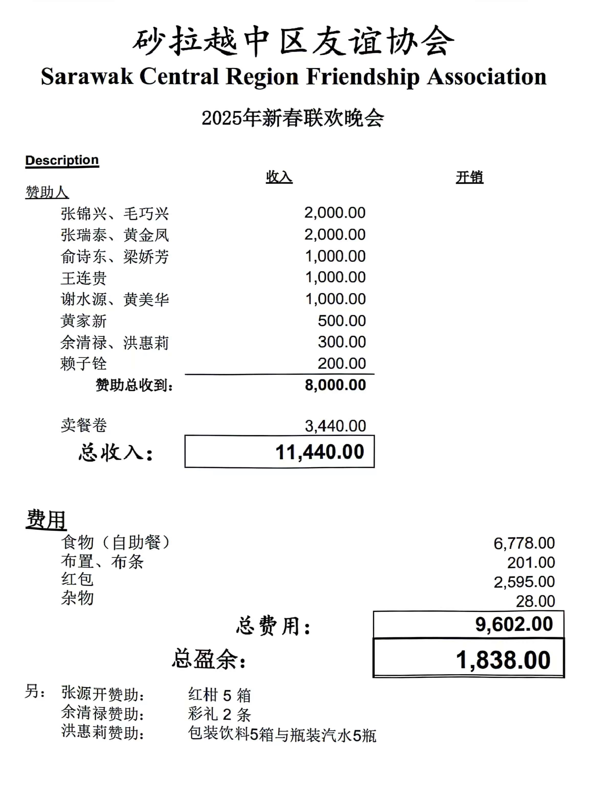 还要感谢主席,理事们在本次筹备中给予关心,指导和协助。特别感谢今晚赞助活动经费的赞助人。感谢每年赞助新年红柑的张源开老朋友。 你们的赞助使我们在筹备过程中勇敢向前,无后顾之忧。我们掌声感谢您们。感恩有你们。