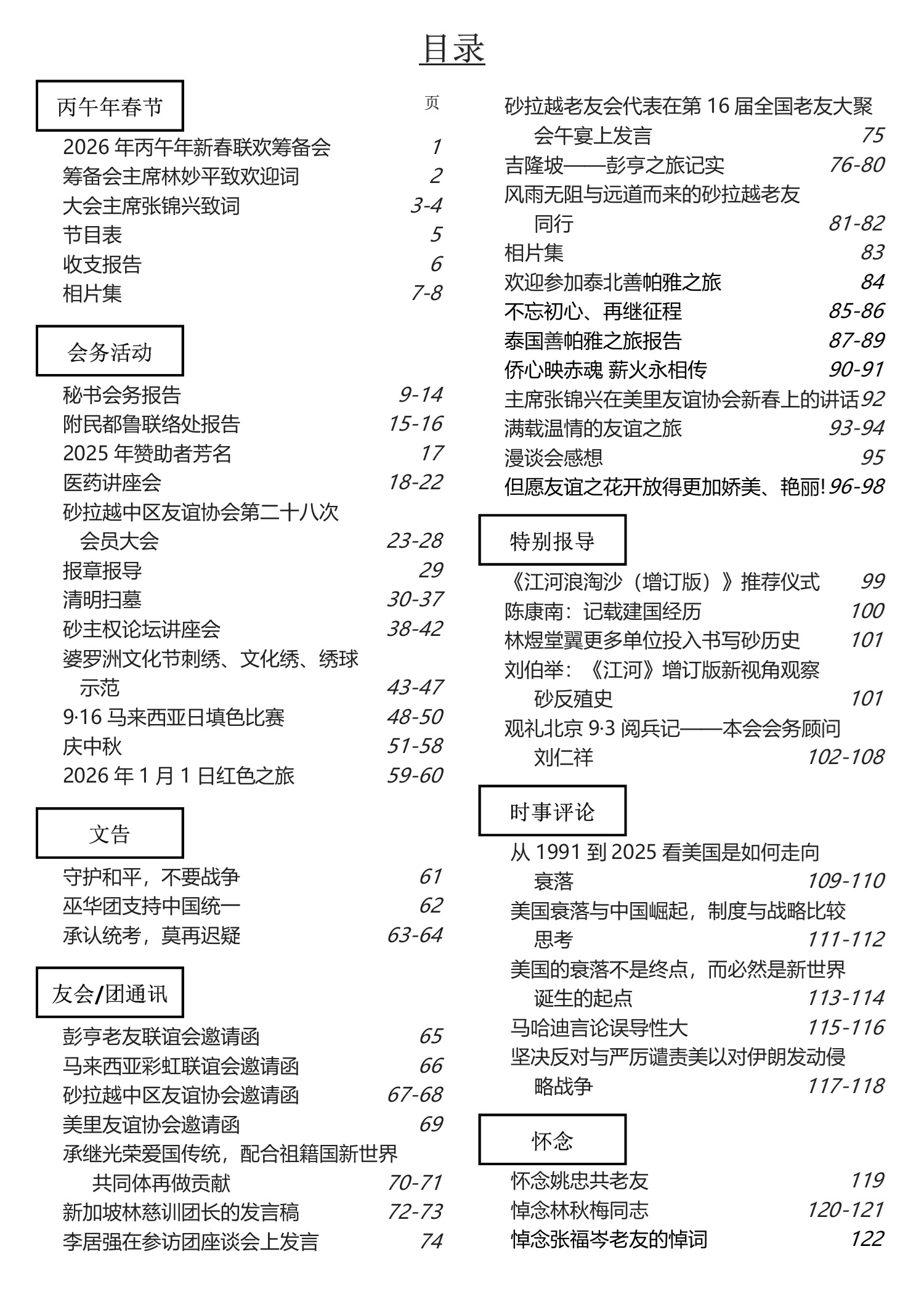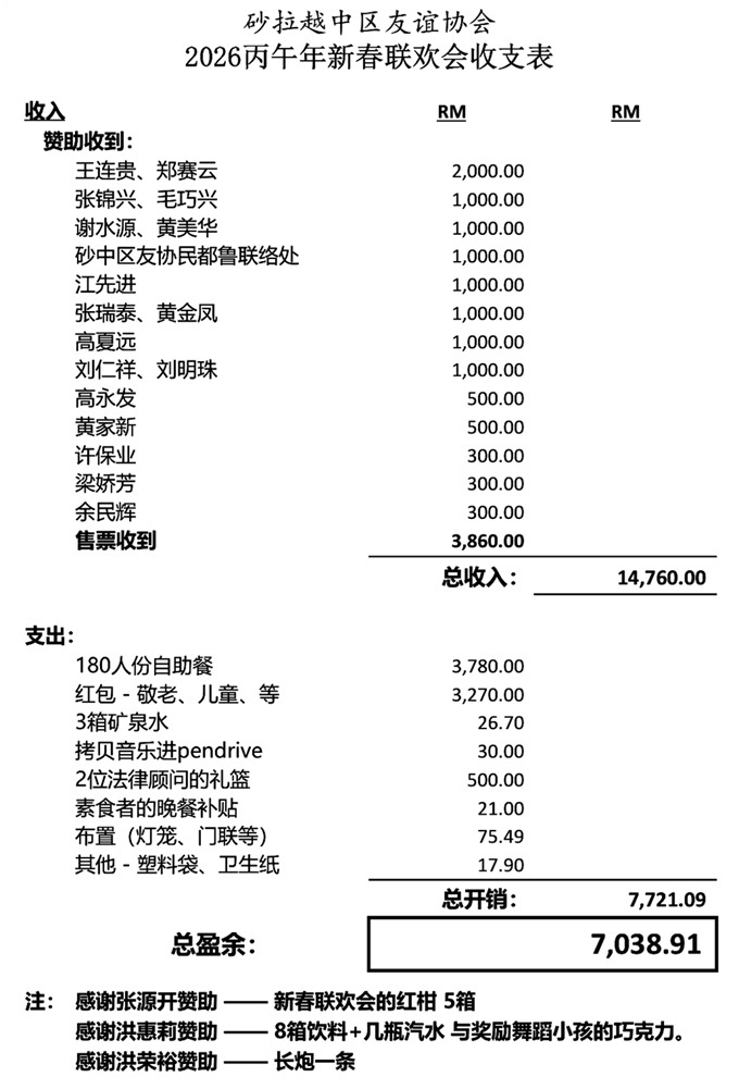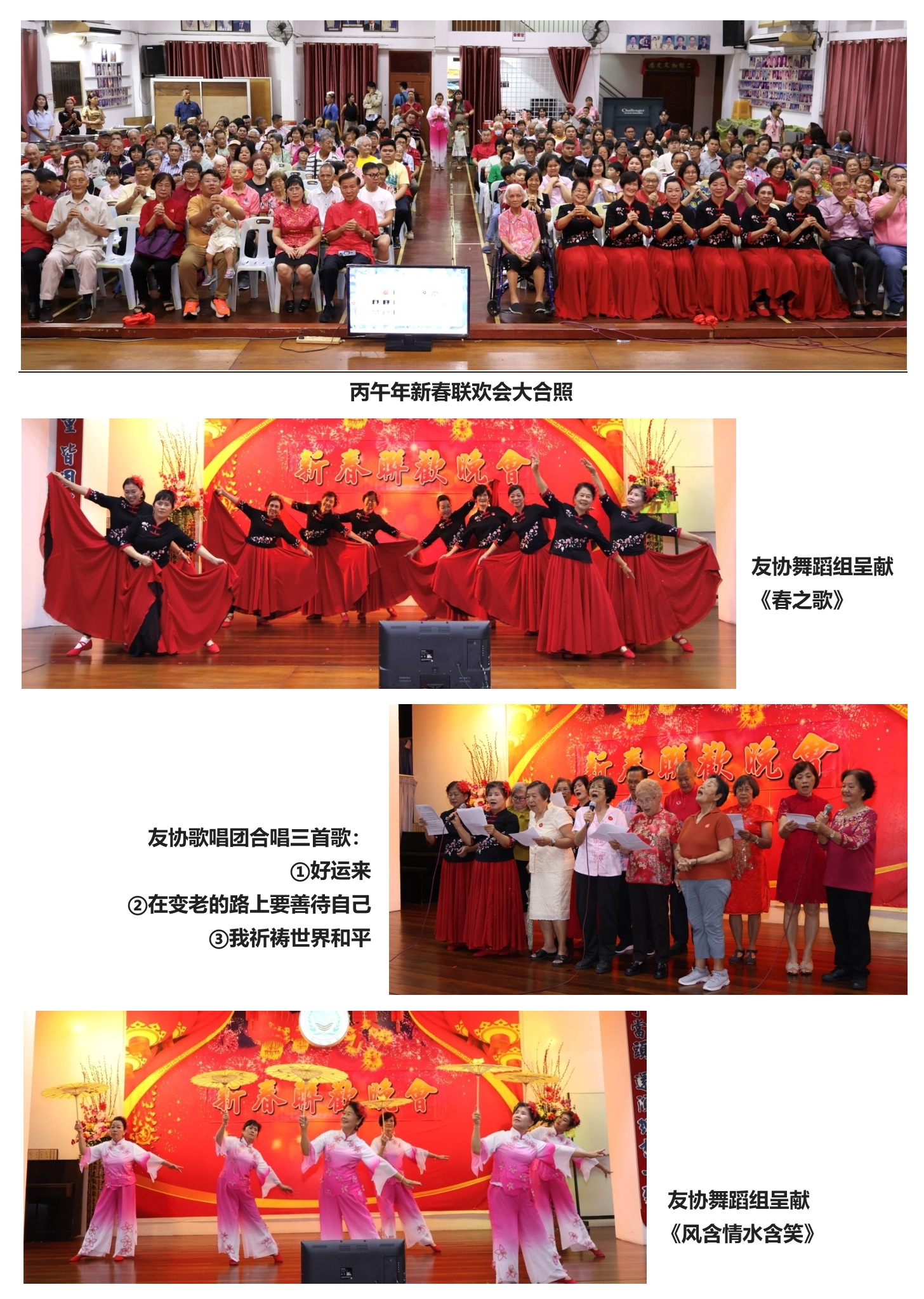 今晚是砂拉越中区友谊协会在这里举行2026丙午年春节联欢晚会。在署理主席吳松花老友及筹备会主席林妙平老友的带领下,各项工作安排有序。在此我谨代表全体理事会、青少团及婦女组感谢筹备会同仁的无私奉献,努力发动会员们及青少团们岀席晚会。你们的热烈光临,促成场面热闹且温馨。在此我僅以最热情的掌声欢迎各位的光临並祝大家新年快乐、万事如意、身体健康。
