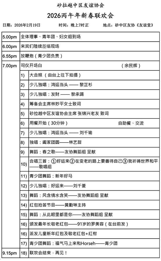 各位会员,春节联欢晚会之后,我们将于28/3/ 2026召开会员大会,共同讨论协会的未来发展。希望大家争取安排时间出席。
