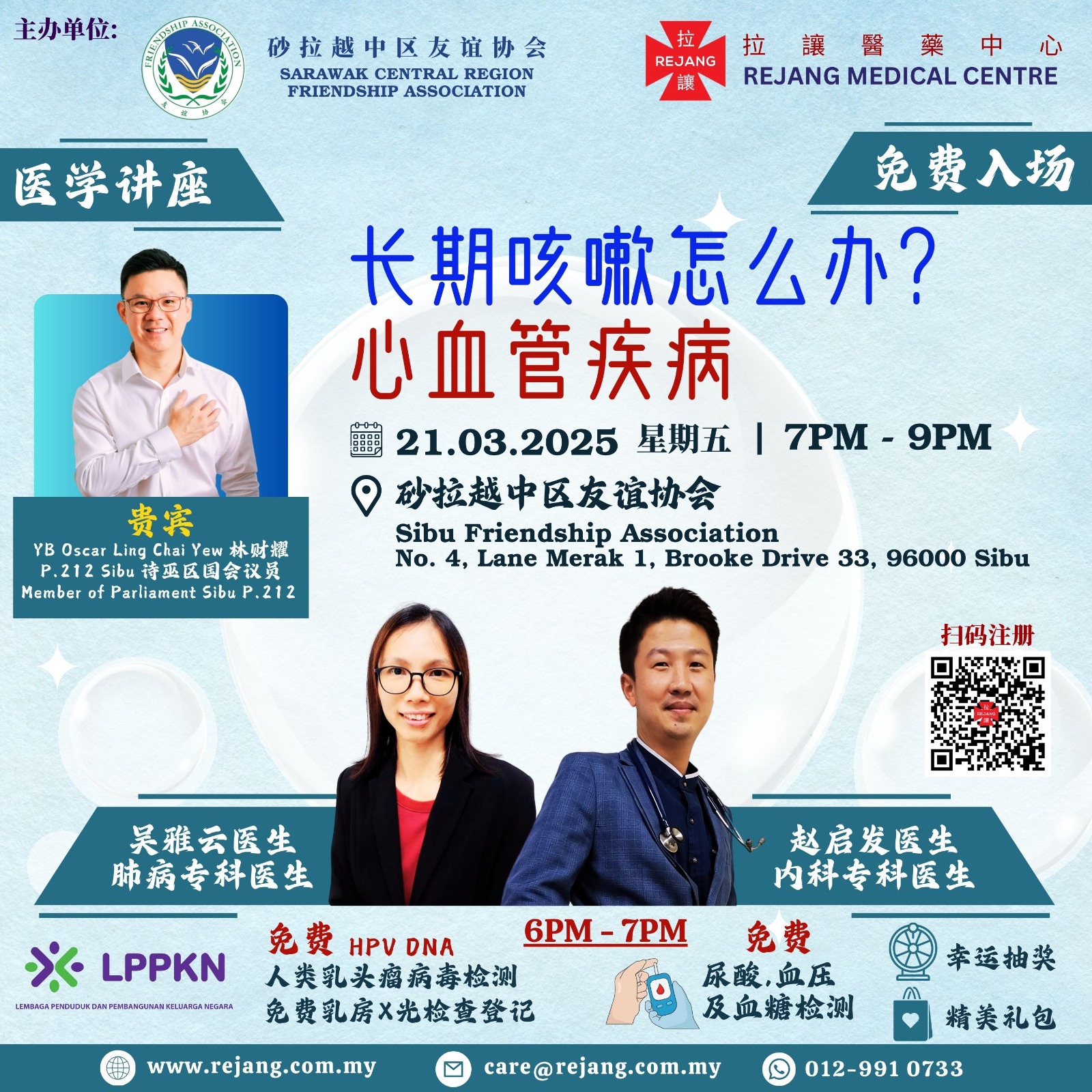 拉让医药中心将安排肺病专科吳雅云医生和内科专科赵启发医生分享“长期咳嗽怎么办”和“心血管疾病”的医疗专题。