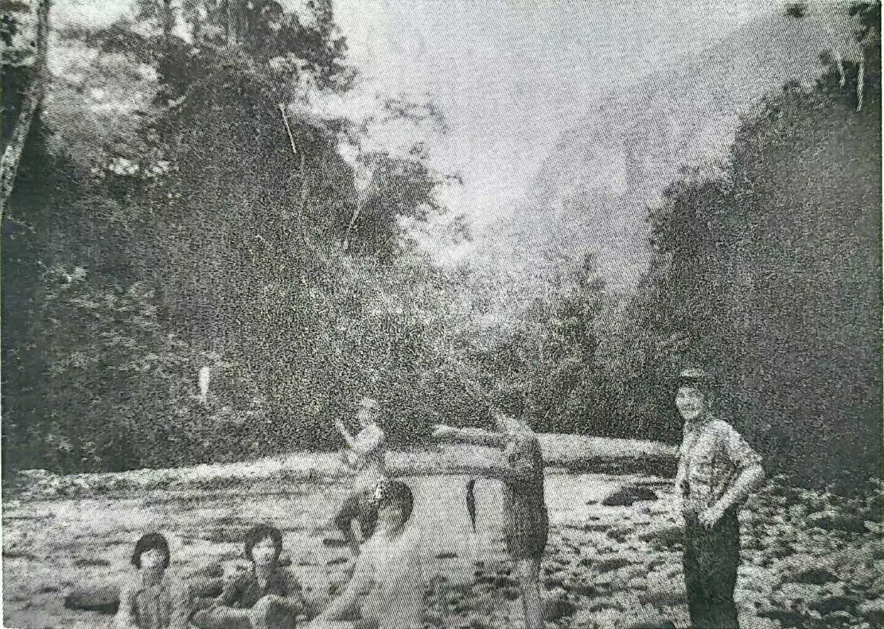 在可靠站补充后,我们还是再向无人烟区,秘密的挺进,不断地翻山越岭,穿涧过谷,越过巴南河的大支流丁捷河,到达另一条大支流杜多河。杜多河的北向就是汶莱国的土地,它与马来奕河尾是遥遥相对的。当时大家坐下来商量,是否要进汶莱一趟。汶莱国是异国,对我们来讲是人地生疏,而且没有详图,只是报纸上拿到一张比例很大的图。上面在马来奕河尾有一黑句点上写了“R”字,应该是Rumah。大家表示无异议后,任凭着闯劲与勇气,向汶莱挺进。也准备万一遇上了古加兵,必要时也要作自卫反击。