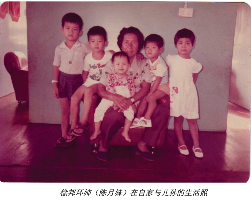 徐邦环被捕时,夫妇俩还是英基罗坡荣光小学的校丁。她深知,丈夫被捕了,自己一定要更加坚强起来,让儿女们放心,更踏实去面对一切挑战。因此,她每天如常去学校煮水泡茶,清洗卫生间等。放工回家后,还要下地劳作,天天要替儿女煮饭、洗衣服…。由于过度劳累,她体质显得有些虚弱。一天,踏着脚车,不小心翻倒,整个人跌入水沟,手腕骨折断了,真是“屋漏遍逢连夜雨”呀。亚婶包扎好手腕,一声不哼,忍着伤疼,忍着内心的痛,又照常每日上学校为课室打扫清洁…回家还是煮饭洗衣…。她总是笑哈哈面对儿子,面对邻居,无怨无悔为家庭,为子女操劳。亚婶是个伟大的母亲!