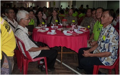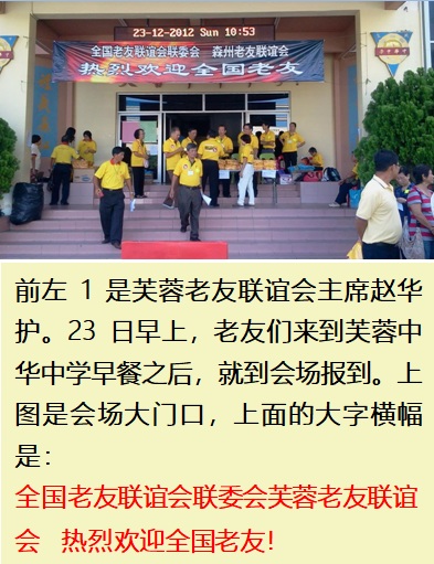 2012年12月22日沙巴、印尼和砂拉越古晋、实巴荷、诗巫、民都鲁、石山、美里等各地老友,在总团长俞诗东和古晋团长蔡色荣、诗巫团长谢水源、美里团长李玉生带领下,一共107位来到花城-芙蓉(森美兰州的首府)参加老友大团聚 - “石火亮花城”。