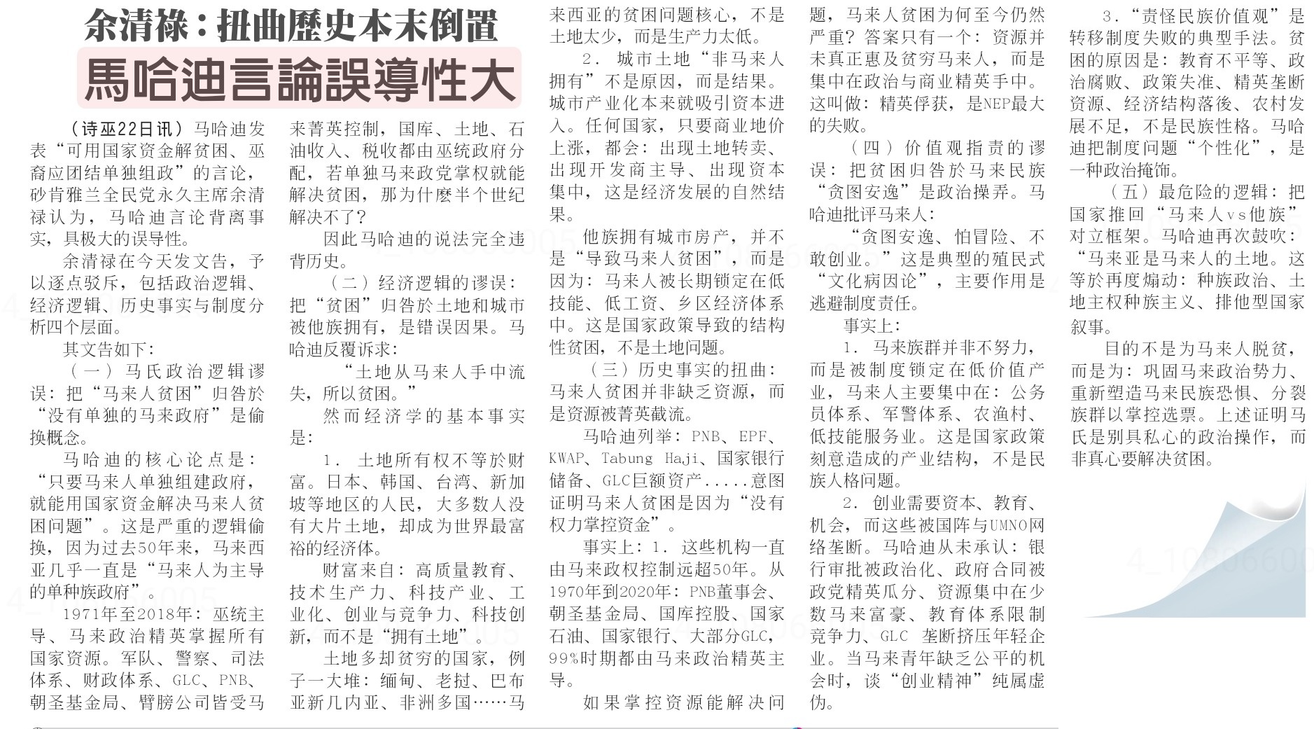 (二)经济逻辑的谬误:把“贫困”归咎於土地和城市被他族拥有,是错误因果。马哈迪反覆诉求:“土地从马来人手中流失,所以贫困。”