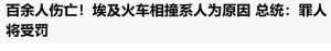 “埃及交通部称,初步调查显示,有身份不明人员关闭了一列车的紧急制动系统,该危险行为导致了两列火车相撞。”
