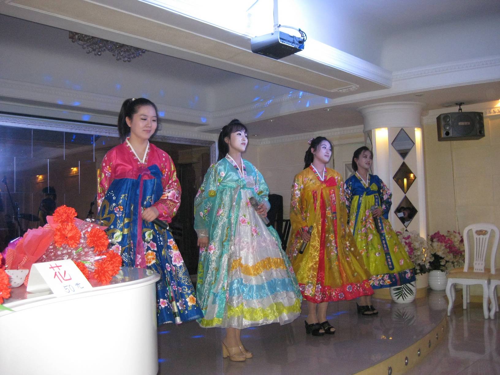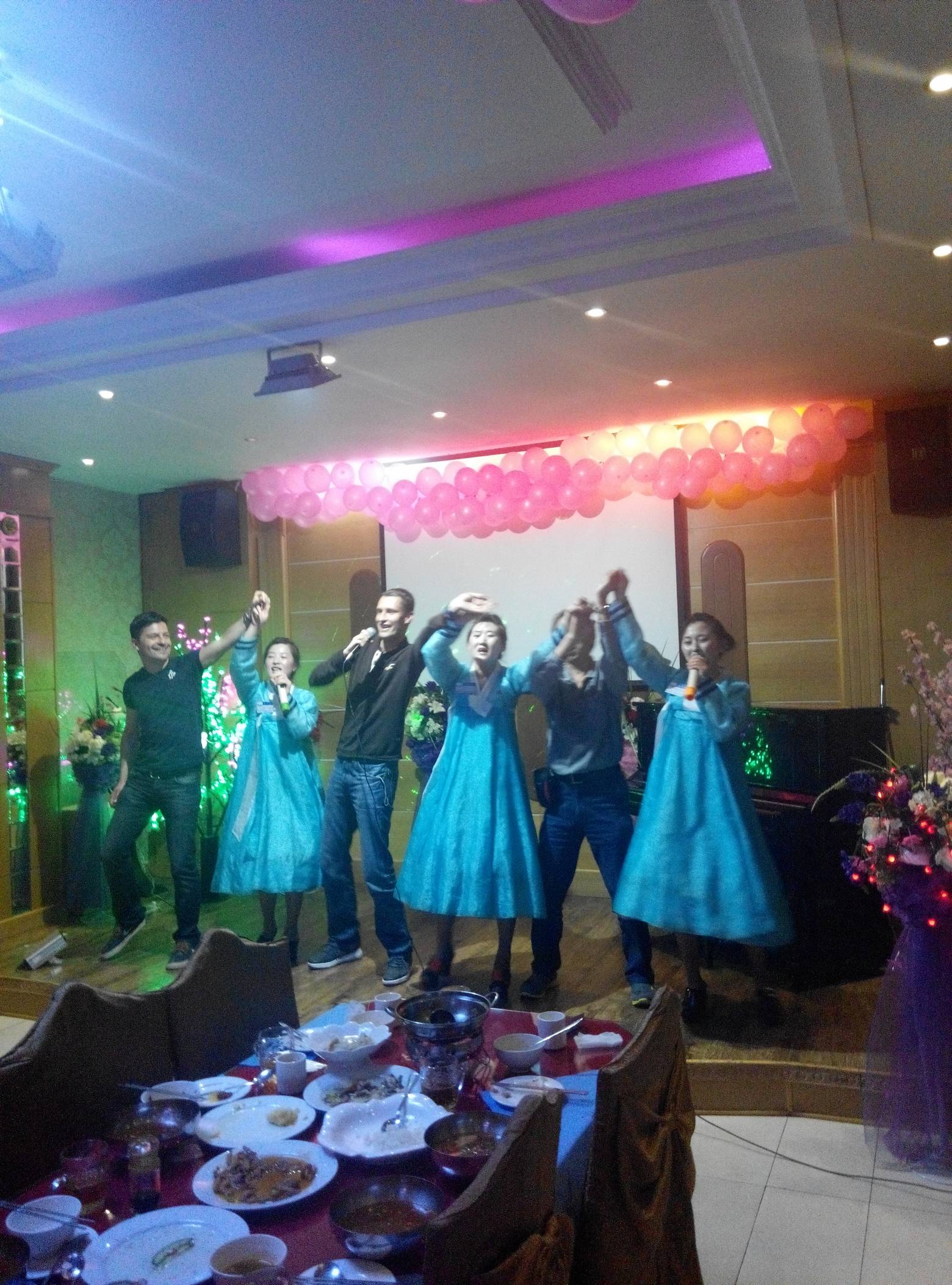 音乐响起,两名服务员登台了,她们先是唱了朝鲜民歌“阿里郎”,然后再唱其他的歌曲,接着开始了“欢乐时光”。