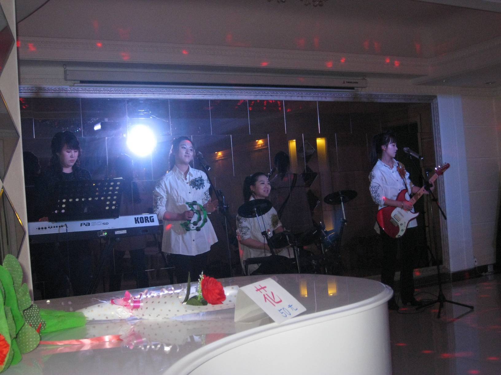 另一例子,在朝鲜的最后晚餐,导游说是他们公司的特别安排,好让我们在离开朝鲜前能够有个特别好的印象。那是一家有着高级装潢的餐厅,他们特别包了一个厅,有舞台和舒服的空间,菜肴既精致又好味道。