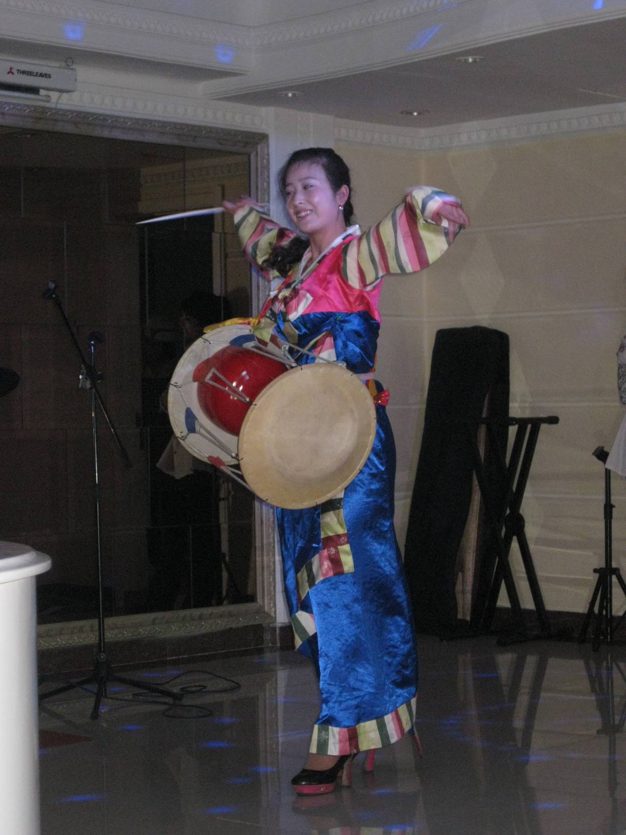 正当我们吃得差不多饱的时候,舞台演出正式开始,漂亮的女演员开始一一登场,有唱民谣“阿里郎”的,也有民族舞的表演,更唱了一首大马人创作的中文歌——“小薇”, 还组了一个女子乐队现场伴奏,认真一看,这不是刚才给我们端菜倒水的服务员们吗?只见她们每个都是能歌善舞,一场表演看下来,真的是让人再三回味。
