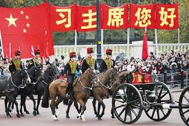 英国女王伊丽莎白二世在伦敦皇家骑兵检阅场举行隆重仪式,欢迎中国国家主席习近平对英国进行国事访问。欢迎仪式中,习近平与夫人彭丽媛和女王夫妇一起乘坐女王的御辇——皇家马车,经皇家大道,前往女王宫邸白金汉宫下榻。