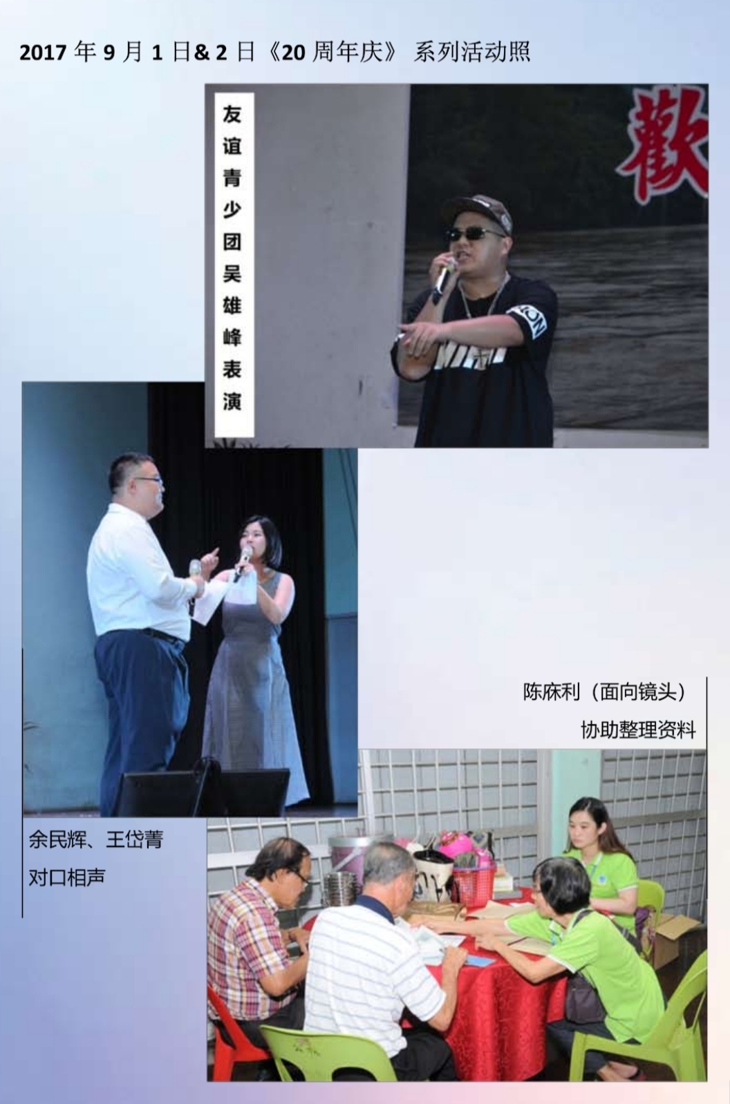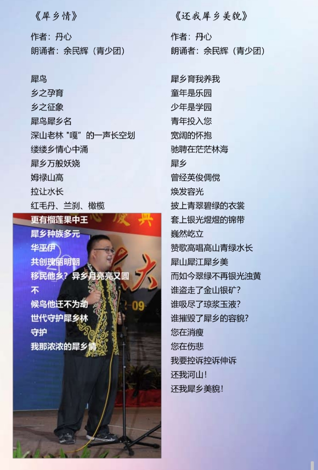 二十周年庆系列活动照(2017年9月1日&2日)、二十周年庆朗诵的诗:《咏犀乡》、二十周年庆朗诵的诗:《犀乡情》、《还我犀乡美貌》、2018年10月7日,友谊公园清洁运动、2020年清明节