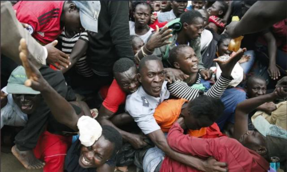这是4月11日,东非肯尼亚首都内罗毕,非洲最大的贫民窟基贝拉,数千人拼命抢救济粮引发踩踏,警方不得不投放催泪弹驱散人群,多人死亡,血泪遍野。